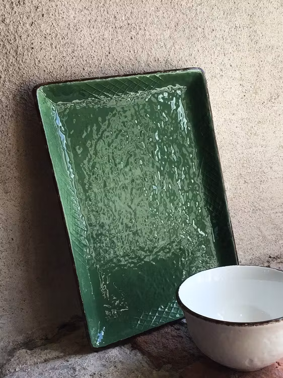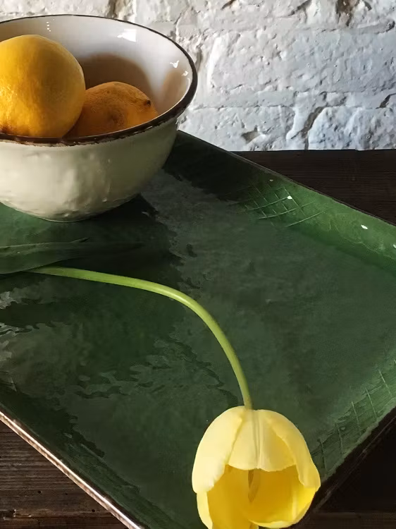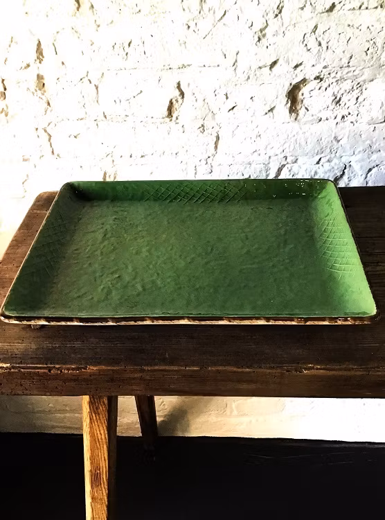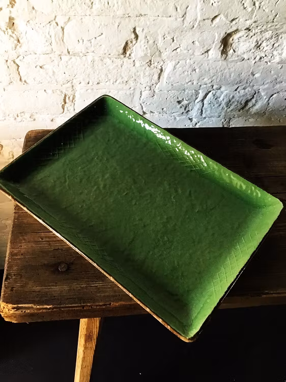 Ett stort och härligt serveringsfat med en oregelbunden glansig yta och brun kant. Kommer i färgerna grönt, vitt och grått