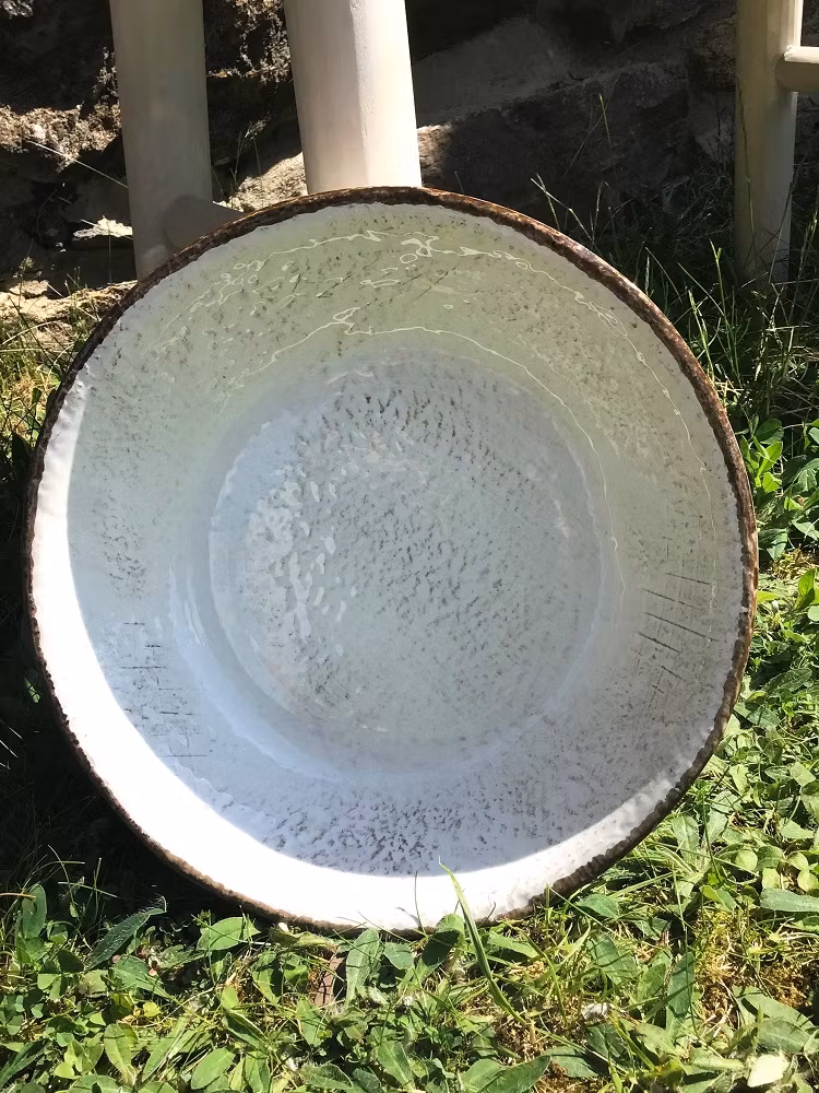 Skålen är handgjord och passar till mesta i matväg. Den är vit med brun kant och har en oregelbunden, glansig och antik yta.