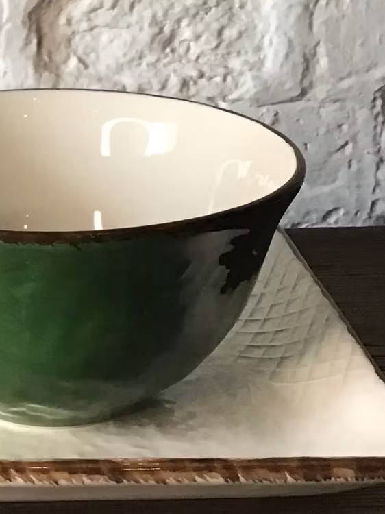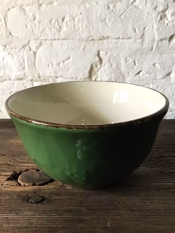 Skålen har en oregelbunden glansig yta. Grön med brun kant.