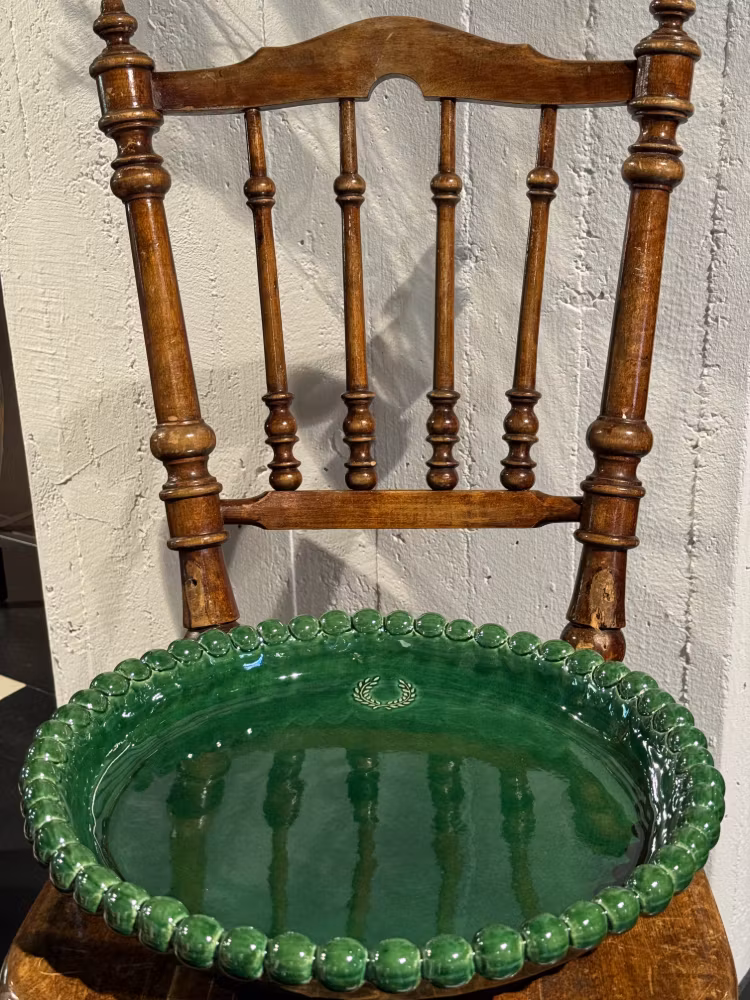Ett stort handgjord, rund fat med "bollar" på kanten i en mycket vacker grön färg. Fatet kommer från en producent i Toscana. De levererar högklassiga och användbara produkter med stor finess.