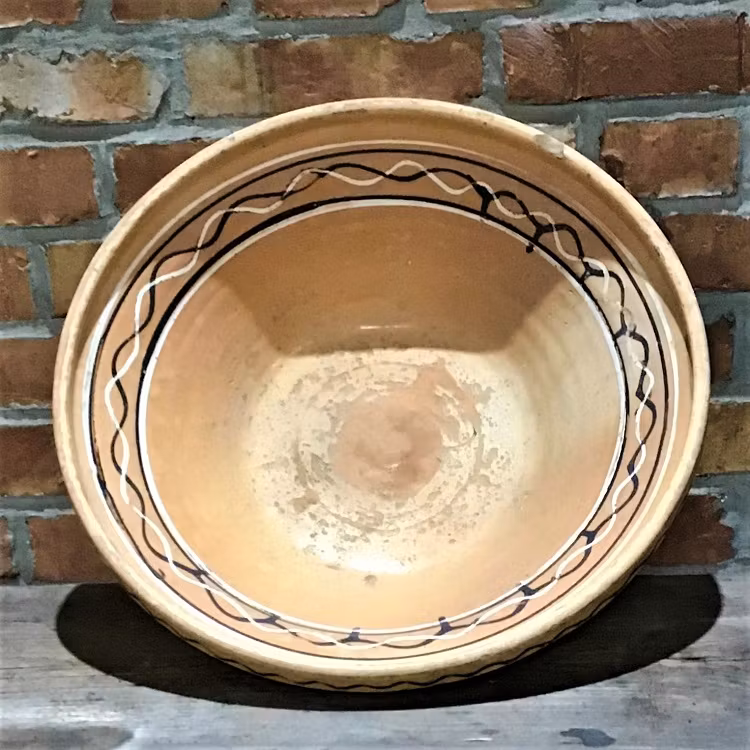VINTAGE. Ett helt magiskt stort terracottafat med dekor i brunt, vitt och svart.