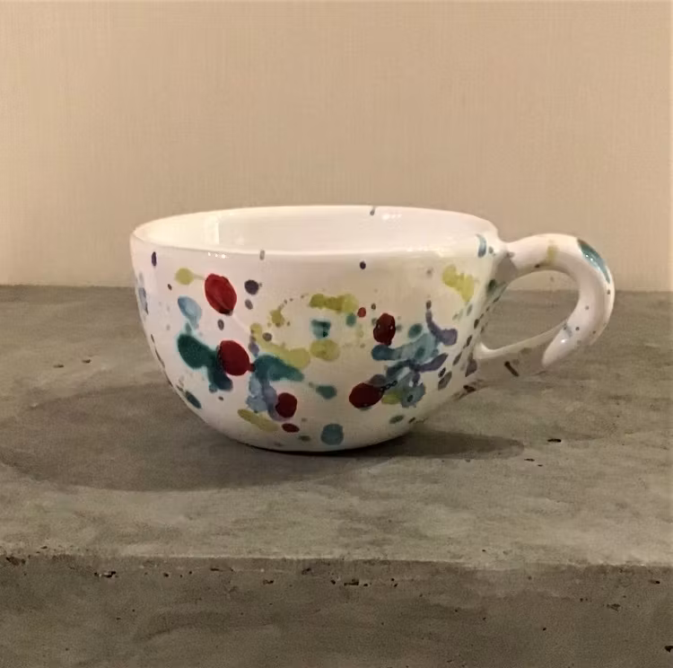 Den handgjorda koppen är dekorerad i olika färgnyanser med en speciell penselteknik som gör varje kopp unik.