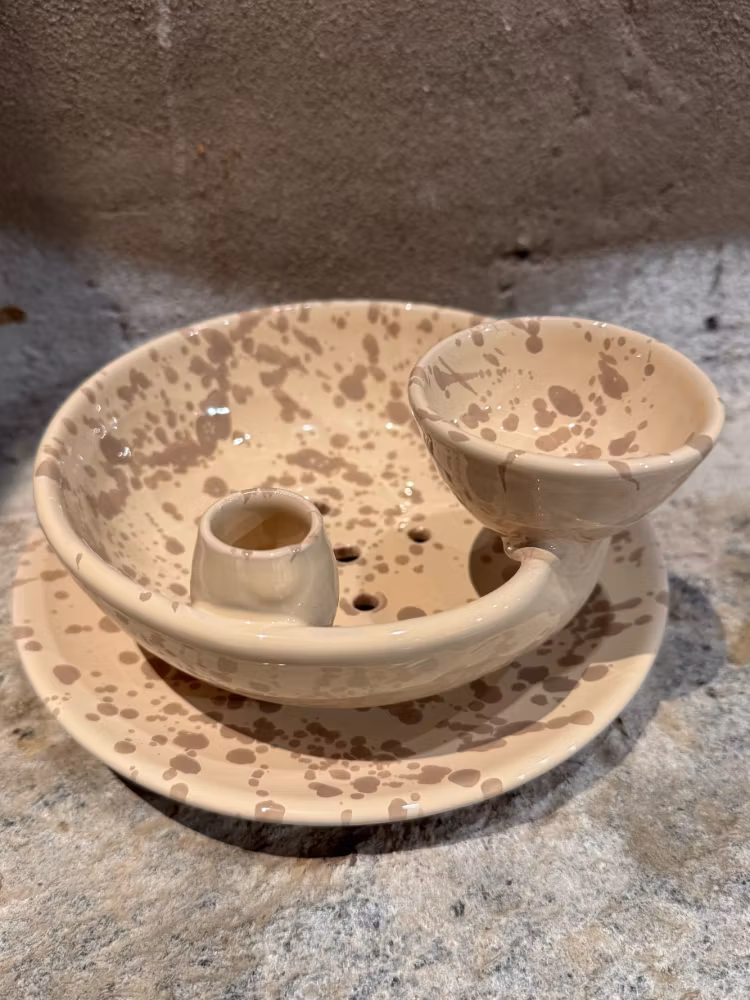 En anrik producent från södra Italien närmare bestämt i provinsen Lecce, keramikens mecka, producerar detta härliga, klassiska och prickiga mönstret. Det kallas också för Spruzzi.