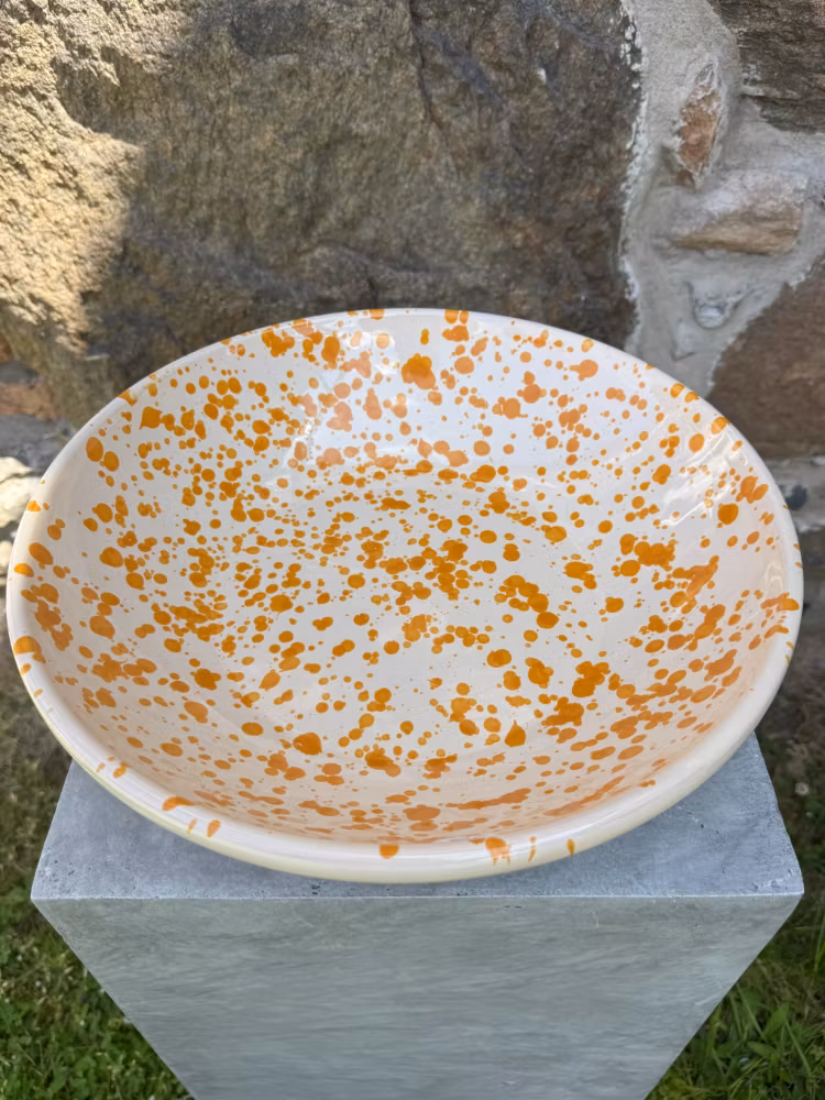 En anrik producent från södra Italien närmare bestämt i provinsen Lecce, keramikens mecka, producerar detta härliga, klassiska och prickiga mönstret. Det kallas också för spruzzi.