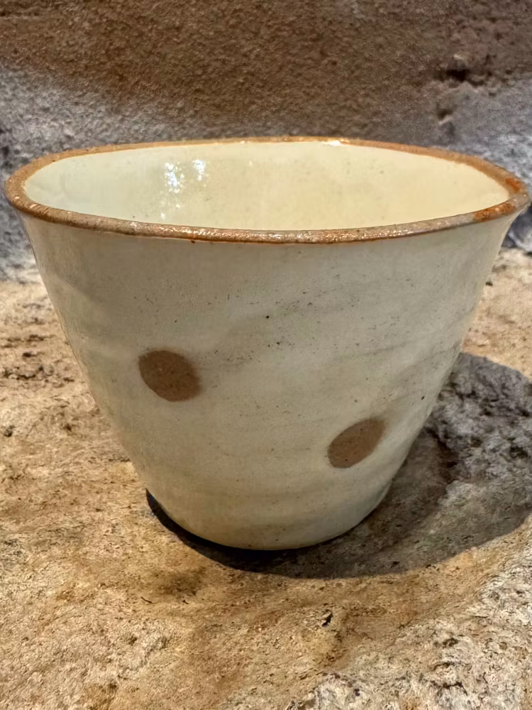 Japaninspirerad rustik keramik i cremfärgad glasyr med bruna detaljer.