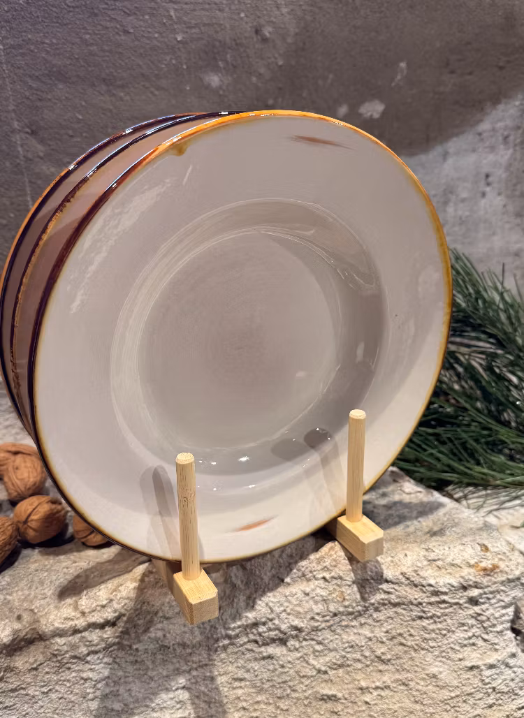 Tallriken är cremefärgad med bruna detaljer.