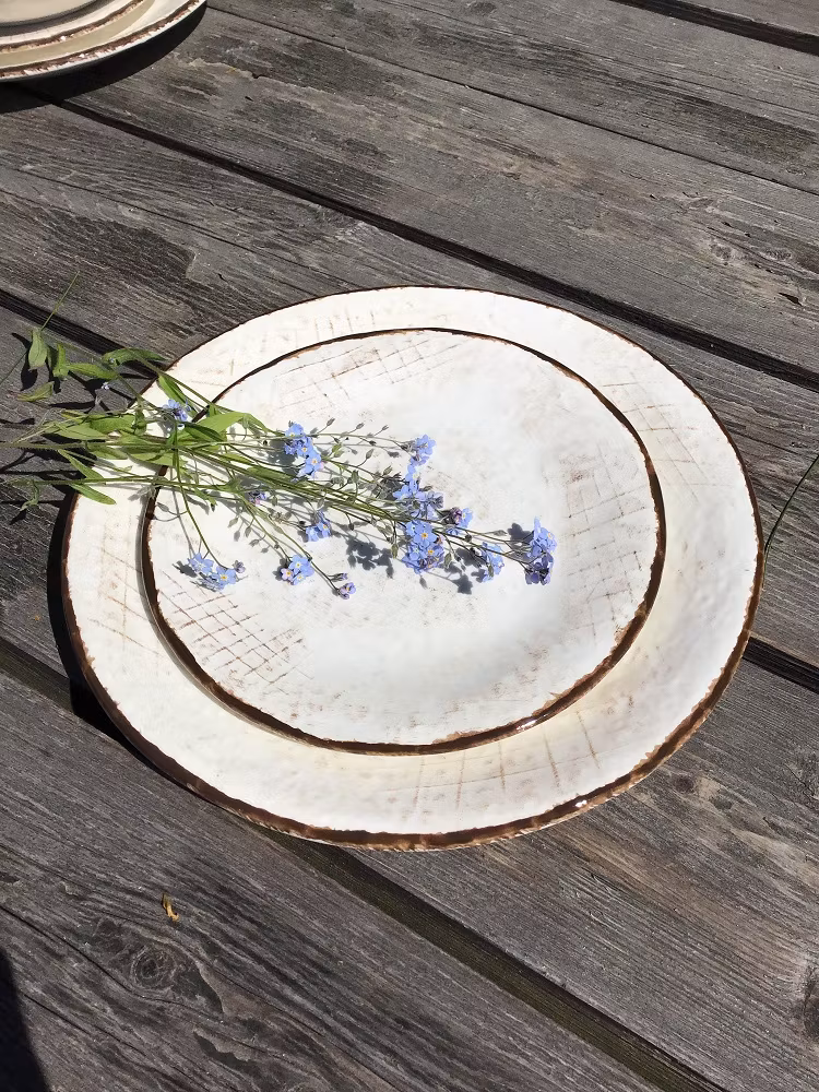 Tallriken är handgjord, modern och användbar med en oregelbunden glansig och antik yta med brun kant.